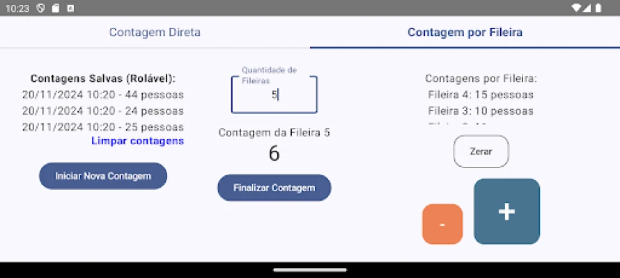 Contagem por fileiras: Insira o número de fileiras e registre a quantidade de pessoas em cada uma, garantindo um total preciso.