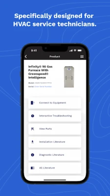 The Carrier Service Technician app provides an easy to use, powerful app that is designed to help the technician standing in front of a unit. The app helps them at the job site to find out what parts they need to make repairs, and it has an on-board GPS to help identify the closest location to find the parts.