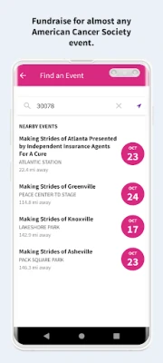 Note that you must be a registered participant of one of our events to use this app. Register for Relay For Life and Making Strides Against Breast Cancer directly from the app. Verified participants of ResearcHERS, Real Men Wear Pink, and DetermiNation events can also accept donations using the app.