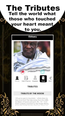 Share & Connect: Instantly share tributes and memories with family, friends, and the community, helping everyone stay connected during the mourning process.