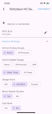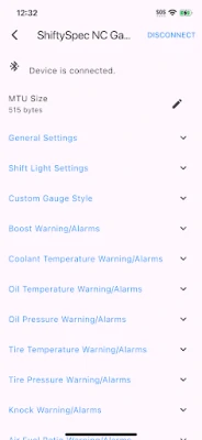This app is for configuring and upgrading ShiftySpec brand automotive gauges for the NC generation MX5. You can fully customize all functionality of the gauge, all over Bluetooth Low Energy (BLE)! Configure the display appearance, alarm thresholds, and deliver firmware updates as well.